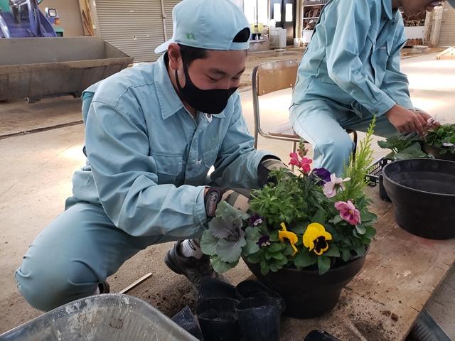 造園科1年生が、自分達で育てた草花を使い、コンテナガーデンを作製しました。パンジーやハボタンやキンギョソウなど色んな色や種類の草花を使って、各生徒達の個性がいっぱい詰まった作品を完成させました。この愛情がたくさん入った作品は、11月8日(日)の北稜祭で販売予定です。数に限りがありますが、ご購入をよろしくお願いします。
