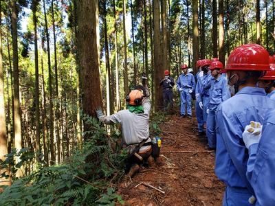 造園科2年生が、森作り研修会に参加しました。日頃から樹木や草花の学習を行っていますが、進路の幅や視野を広げるため今回は林業の現場を見学しました。玉名森林組合様や玉名地域振興局様のご指導のもと、とても貴重な話を聞くことが出来、チェーンソーなどの実技体験もさせていただき今後の進路に繋がる良い機会となりました。