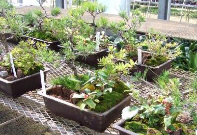 盆景とは、鎌倉時代の箱庭を発展させたもので、浅い角鉢に土 (腐植土など) で築山を作り、景石や苔などを配置して、庭園の風景を再現するものです。