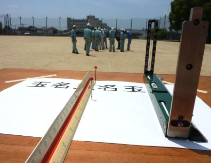 6月20日(土)に田んぼアートの田植え会がありますが、下絵が完成していないと田植えができません。下絵を描く担当は造園科の皆さんです。本日より下絵描きの練習をグランドで始めました。