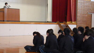 その後大きな声で校歌斉唱をし、生徒会から校の変更の報告、JRC部からボランティア活動の呼びかけがありました。