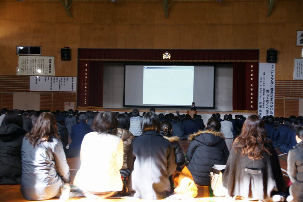 第2学期保護者会・講演会 投稿日時 : 2014/12/07 学校サイト管理者 本日、本校体育館にて保護者会および講演会が行われました。今回は、ピットクルー株式会社より講師をお招きし、生徒・保護者を対象に携帯電話やインターネット利用について御講話いただきました。 特性やトラブルに遭ったときの対応など、具体的な事例を交えながらわかりやすくお話いただき、生徒・保護者・教職員で内容を共有できました。ぜひ、ご家庭でも話題にしていただければと思います。その後、学校からの諸連絡、学年会、学級懇談会が実施されました。寒い中、ご参加いただいた保護者の皆様ありがとうございました。A01北稜アルバムはこちらから