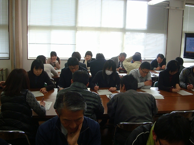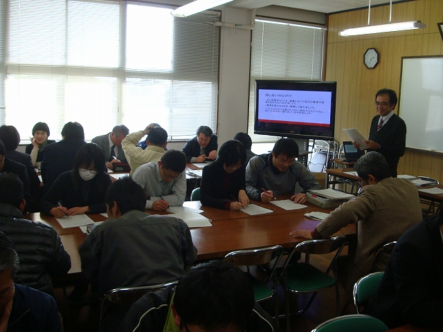 今回この事業を主査する井芹知弘教諭が研修会の中心になり、職員を生徒に見立てて、