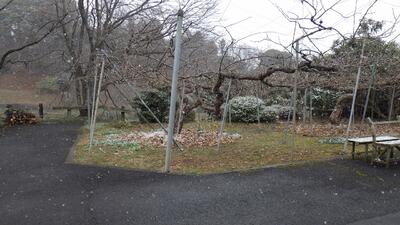 果樹園から帰るときは木々の葉が白くなっていました。