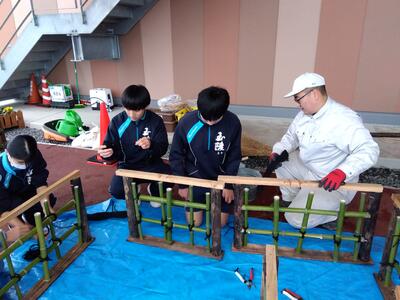 12月19日(火)にくまもと県北病院にて門松の制作を近隣の玉陵小学校・玉陵中学校と行いました。本校の造園同好会が指導者となり、小学生は門松のマツやウメやハボタンなどの植栽を行い、中学生は周りの装飾の竹垣を制作してもらい、共同でオリジナルの門松3m程度の大きな作品を作りました。参加した生徒達も笑顔で会話しながら楽しく実習を行い充実した様子でとても良い取り組みとなりました。