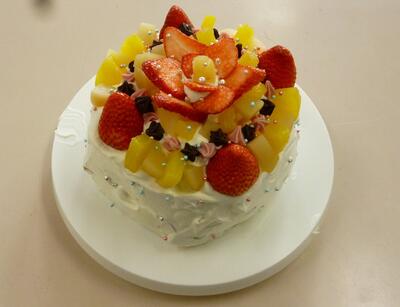 スポンジ作りからデコレーションまでを行いました。たくさんのクリームとフルーツでおいしく仕上げることができました。