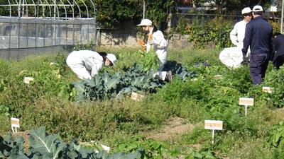 その後、造園科が日頃の実習を活かして野菜の植え付け方を動画などを用いて説明を行い、家政科学科と一緒にハクサイ・キャベツ・ブロッコリーの中から苦手な野菜にチャレンジして植え付けをみんなで楽しく行いました。
