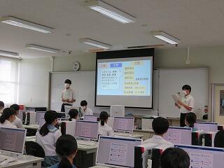 まず、中学生にご挨拶。 2年生が科の説明をします。