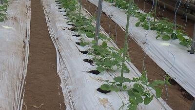 野菜専攻生が定植したトマトは小さな実をつけ、メロンは雄花がたくさん咲き、誘引をしっかりしています。