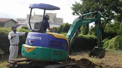 実技ではパワーショベルを使って、操作アームの動かし方の説明を受け、実際に穴を掘りました。