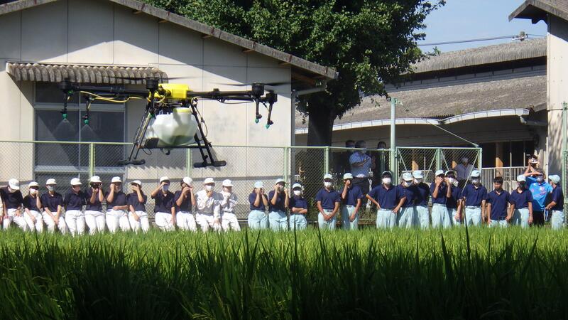最後に学校の水田で農業用ドローンによる消毒を見学し、代表者が操作をさせてもらいました。