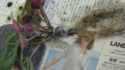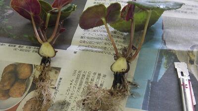 シクラメンの苗の根をきれいに洗い、カミソリで2分割し、違う品種同士をくっつけ接ぎ木テープで巻きました。