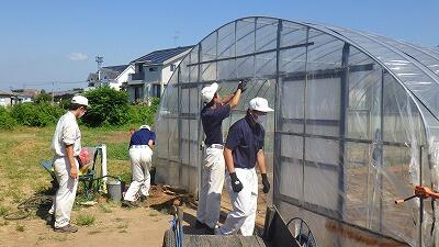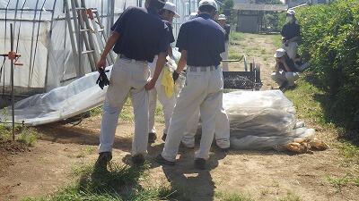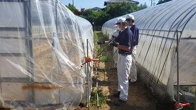 3月に定植し、6月に収穫を終えた肥後グリーンメロンのビニルハウスの天井ビニル外しをしました。