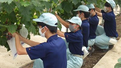 果樹専攻では温室で栽培を始めたブドウの生産が始まり、袋がけをしました。