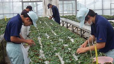 草花専攻はシクラメンの中央部に光が入るようにリングはめを行っています。