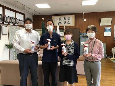 株式会社九州プレシジョン(玉名市安楽寺)が開発に携わり発売された消毒液『ナチュラルバリアN』『ナチュラルバリアEX』計24本を、令和4年5月31日に来校され寄贈していただきました。