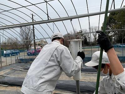現1年生がビニルハウス内のマルチ張りや杭打ちを行いました。