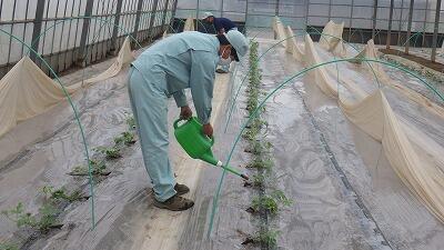定植終了後、ジョロで優しく灌水しました。ビニルハウスの中は春を通り越して夏が来ました。