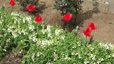 農場のスイカやメロン、マリーゴールド、花壇のパンジーやチューリップも元気に新年度を迎えました。