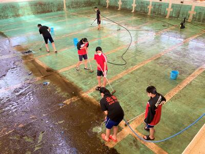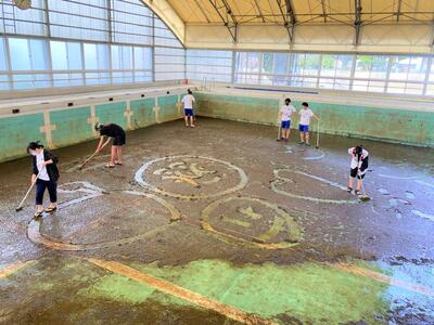 外練の間にプールに貯まった泥やコケを洗い流し、壁や底をブラシで磨きました。