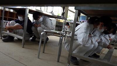 実習棟にいた私たちは先生の指示のもと、実験机の中に入って頭を守りました。