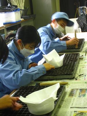 草花のシクラメンの温室では花がきれいに咲きそろっていますが、育苗温室では早くも来年度のシクラメンの播種が行われました。