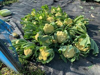 まず、カリフラワーやハクサイ、ダイコンなどを収穫して