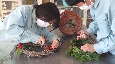 設計図とおりにはいかなかったものの、ヒノキやヒイラギの葉を多く使ったり、リース台が見えるように工夫したりして楽しく飾り付けをしました。