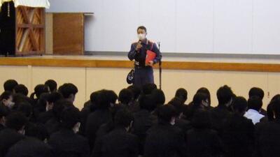 雨が降り出し、避難場所が体育館に変更になりましたが、みんな真剣に避難し、点呼報告を行いました。その後、玉名消防署の方より、消防士の仕事内容や緊急連絡の実際の通報体験などがあり、まずは身の安全を確保することや出火場所(建物名や住所など)を確実に伝えることなど教えてもらいました。