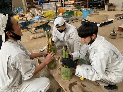 まず、材料となる竹を水につけた籾殻で磨きます。