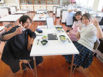 今回は2回目の調理実習で、「五目炊き込みご飯」と「じゃがいもとわかめの味噌汁」の2品です。3人の班で協力してできました。