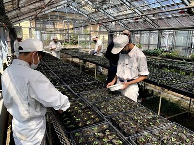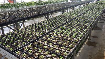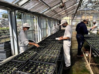 草花温室では専攻生が鉢上げしたパンジーや金魚草の苗が次のステージを待っています。