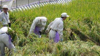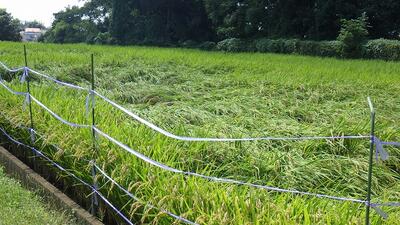 農場では水田の稲が少し倒伏してしまい、これ以上倒れないことを願っています。