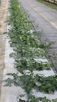 トマトは色づき始め、スイカは三本仕立てが終わりました。