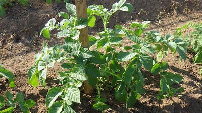 ジャガイモの生長がマルチは約高さ20cm幅30cmに対して、マルチ無しは約高さ30cm幅50cmと違っていることに気づき、なぜそうなったのか意見を出しあいました。