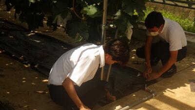 梅雨まっただ中の水曜日、雨が弱まったところで、2年生はブドウの仕上げ摘果、3年生は課題研究の測定・調査を行いました。