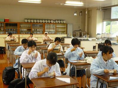 入学後初めての検定試験(きゅうり薄切り、計量)を実施しました。