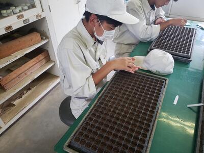 草花専攻はパンジーの播種、1年生はキャベツ、ハクサイ、ブロッコリーの播種を行いました。果樹専攻は果樹園で温州ミカンの摘果を行いました。