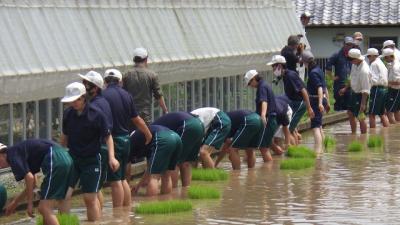 ぬるぬるする田んぼに入ると歓声が上がりました