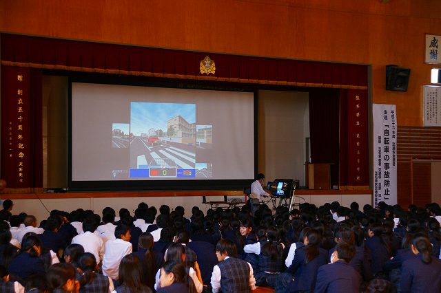 生徒代表数名と職員が自転車シミュレーターを体験しました。