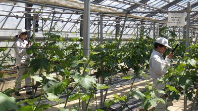 ハウスで育てているキュウリやトマトが大きくなっていて実がなっていました。