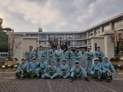 今年は、緊急事態宣言などで普通の生活が出来ず、大変な1年でしたが、来年はコロナに負けず笑って過ごせる良い年になればと思う気持ちを込めて造園科1年生のみんなで学校に大きな門松を作りました。また、お家の方にも飾れるように個人の門松も作製しました。