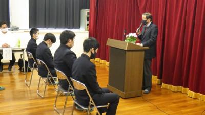 最後に、県立農業大学校に進学する4名に玉名地域農業教育振興懇話会会長より激励の言葉と記念品が渡されました。
