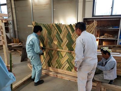 今回はその一部で、竹垣を作成している様子です。創作垣で網代垣を作成しています。