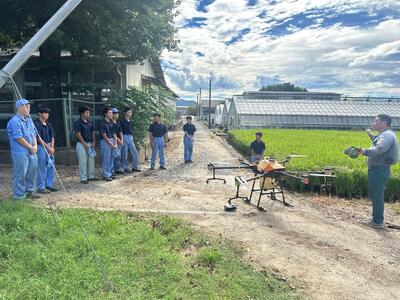 有限会社ミドリの上原様にご来校いただき、本校の水田にドローンを用いての農薬散布を実施しました。