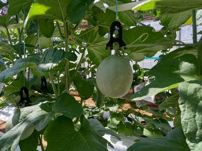 果実はつるつると綺麗な果皮をしていますが、これから大きくなるにしたがってメロン特有の網目模様が出てきます。