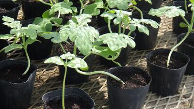 造園同好会が同じ仲間の野菜であれば、接ぎ木出来る事から、一石二鳥の野菜が作れるのではないかと疑問に持ち、トマトとジャガイモの接ぎ木を行い、合体野菜を栽培しました。昨年は、接ぎ木の時期やタイミングなどで栽培は失敗してしまいましたが、今年度は上部にトマト、下部にジャガイモが実り、見事両方の野菜を収穫することが出来ました。