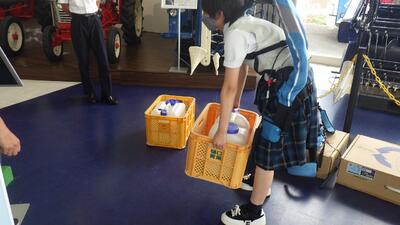 井関農機では農家の高齢化や人手不足の対策として行っているスマート農業の説明と自動運転のトラクターの運転操作、ドローンの操作シミュレーション、アシストスーツの体験を行いました。