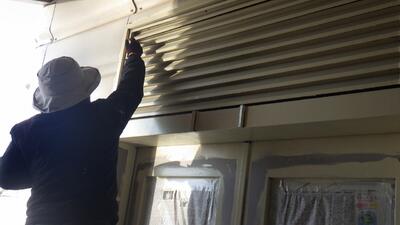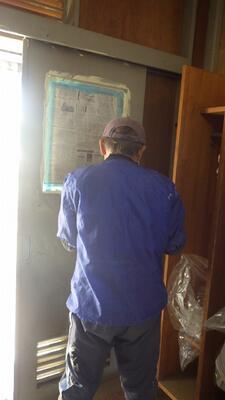 ドアの錆と古い塗料をワイヤーブラシできれいにし、ガラスに新聞紙を貼り付けてペンキを塗る準備がされました。