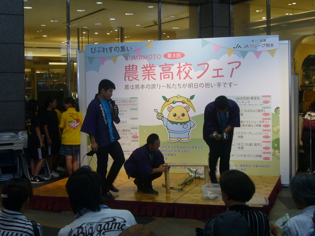 農業高校フェア 投稿日時 : 2018/06/18 HRBT2016 6月9日(土)に熊本市内(びぷれす広場)で農業高校フェアが行われました。県内の農業高校生が一堂に会し農業高校の取り組みをアピールしました。本校からも農業クラブ役員が参加し、農産物の販売や造園科の実演などを行いました。フェアの様子は6月30日にテレビ放映の予定です。H01